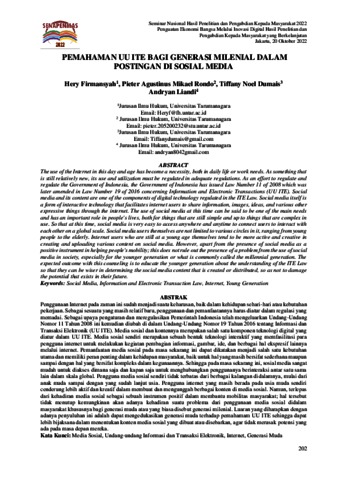 Firmansyah, Hery and Rondo, Pieter Agustinus Mikael and Dumais, Tiffany Noel and Liandi, Andryan (2022) Pemahaman UU ITE Bagi Generasi Milenial Dalam Postingan Di Sosial Media. SENAPENMAS.