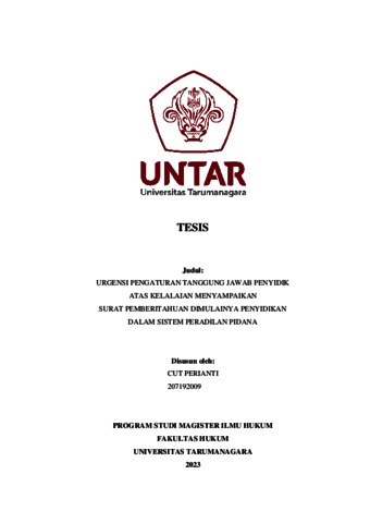 Perianti, Cut (2023) Urgensi Pengaturan Tanggung Jawab Penyidik Atas Kelalaian Menyampaikan Surat Pemberitahuan Dimulainya Penyidikan Dalam Sistem Peradilan Pidana. Masters thesis, Universitas Tarumanagara.