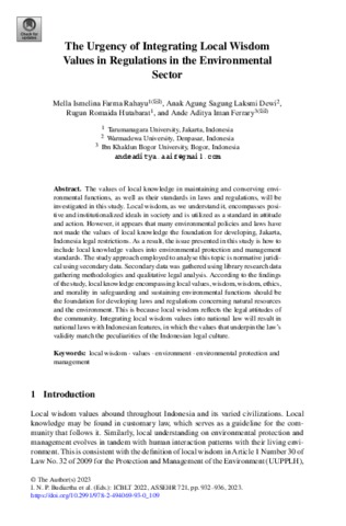 Rahayu, Mella Ismelina F and Dewi, Anak Agung Sagung Laksmi and Hutabarat, Rugun Romaida and Ferrary, Ande Aditya Iman (2022) The Urgency of Integrating Local Wisdom Values in Regulations in the Environmental Sector. Proceedings of the 3rd International Conference on Business Law and Local Wisdom in Tourism (ICBLT 2022). ISSN 2352-5398