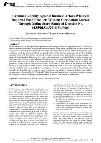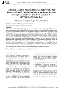 Hutabarat, Rugun Romaida Criminal Liability Against Business Actors Who Sell Imported Food Products Without Circulation License Through Online Store (Study of Decision No. 613/Pid.Sus/2019/Pn.Pdg). Advances in Social Science, Education and Humanities Research, 655.