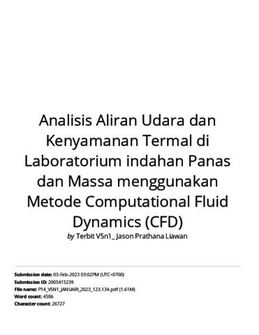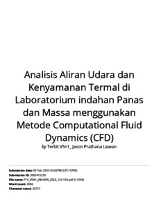 Tanujaya, Harto and Darmawan, Steven and Liawan, Jason Prathana Analisis Aliran Udara dan Kenyamanan Termal di Laboratorium Perpindahan Panas dan Massa menggunakan Metode Computational Fluid Dynamics (CFD). (Turnitin). Jurnal Asiimetrik: Jurnal Ilmiah Rekayasa Dan Inovasi.