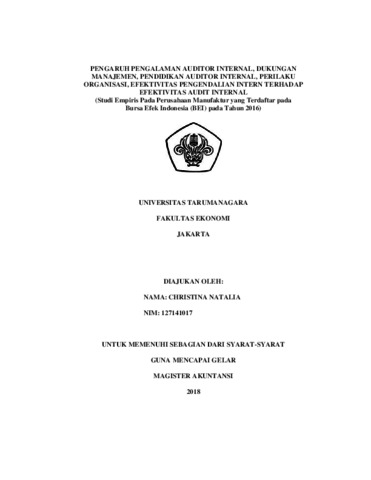 Natalia, Christina (2018) PENGARUH PENGALAMAN AUDITOR INTERNAL, DUKUNGAN MANAJEMEN, PENDIDIKAN AUDITOR INTERNAL, PERILAKU ORGANISASI, EFEKTIVITAS PENGENDALIAN INTERN TERHADAP EFEKTIVITAS AUDIT INTERNAL (Studi Empiris Pada Perusahaan Manufaktur yang Terdaftar pada Bursa Efek Indonesia (BEI) pada Tahun 2016). Masters thesis, UNIVERSITAS TARUMANAGARA.