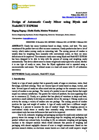 Wulandari, Meirista and Hugeng, Hugeng (2022) Design of Automatic Candy Mixer using Blynk and NodeMCU ESP8266. Green Intelegent System and Aplications, 2 (1). pp. 1-6.