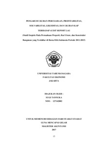 Tannuka, Sugi (2017) PENGARUH UKURAN PERUSAHAAN, PROFITABILITAS, SOLVABILITAS, LIKUIDITAS, DAN UKURAN KAP TERHADAP AUDIT REPORT LAG (Studi Empiris Pada Perusahaan Properti, Real Estate, dan Konstruksi Bangunan yang Terdaftar di Bursa Efek Indonesia Periode 2011-2015). Masters thesis, UNIVERSITAS TARUMANAGARA.