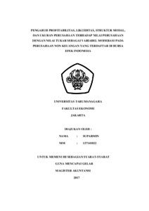 Suparmin, Suparmin (2017) PENGARUH PROFITABILITAS, LIKUIDITAS, STRUKTUR MODAL, DAN UKURAN PERUSAHAAN TERHADAP NILAI PERUSAHAAN DENGAN NILAI TUKAR SEBAGAI VARIABEL MODERASI PADA PERUSAHAAN NON KEUANGAN YANG TERDAFTAR DI BURSA EFEK INDONESIA. Masters thesis, UNIVERSITAS TARUMANAGARA.