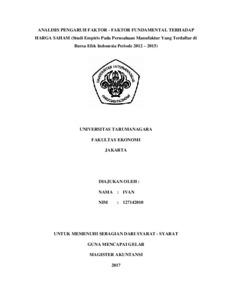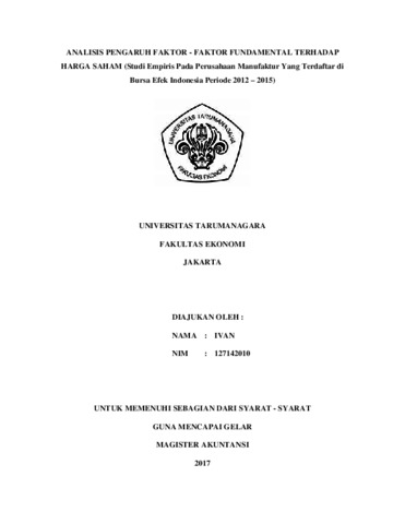 Ivan, Ivan (2017) ANALISIS PENGARUH FAKTOR - FAKTOR FUNDAMENTAL TERHADAP HARGA SAHAM (Studi Empiris Pada Perusahaan Manufaktur Yang Terdaftar di Bursa Efek Indonesia Periode 2012 – 2015). Masters thesis, UNIVERSITAS TARUMANAGARA.