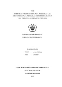 Febrianty, Levinda (2015) DETERMINAN STRUKTUR MODAL PADA PERUSAHAAN LABA (STUDI EMPIRIS PADA PERUSAHAAN SEKTOR PERTAMBANGAN YANG TERDAFTAR DI BURSA EFEK INDONESIA). Masters thesis, UNIVERSITAS TARUMANAGARA.