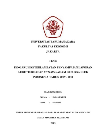 Januardi, Lo (2013) PENGARUH KETERLAMBATAN PENYAMPAIAN LAPORAN AUDIT TERHADAP RETURN SAHAM DI BURSA EFEK INDONESIA TAHUN 2009 - 2011. Masters thesis, UNIVERSITAS TARUMANAGARA.