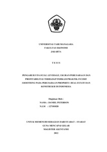 Peterson, Daniel (2012) PENGARUH FINANCIAL LEVERAGE, UKURAN PERUSAHAAN DAN PROFITABILITAS TERHADAP INDIKASI PRAKTIK INCOME SMOOTHING PADA PERUSAHAAN PROPERTI / REAL ESTATE DAN KONSTRUKSI DI INDONESIA. Masters thesis, UNIVERSITAS TARUMANAGARA.