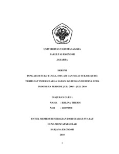 Theios, Erlina (2010) PENGARUH SUKU BUNGA, INFLASI DAN NILAI TUKAR (KURS) TERHADAP INDEKS HARGA SAHAM GABUNGAN DI BURSA EFEK INDONESIA PERIODE JULI 2005 – JULI 2010. Skripsi thesis, UNIVERSITAS TARUMANAGARA.