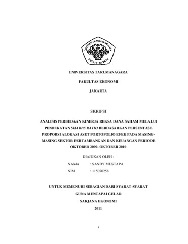 Sandy, Sandy (2011) ANALISIS PERBEDAAN KINERJA REKSA DANA SAHAM MELALUI PENDEKATAN SHARPE RATIO BERDASARKAN PERSENTASE PROPORSI ALOKASI ASET PORTOFOLIO EFEK PADA MASING- MASING SEKTOR PERTAMBANGAN DAN KEUANGAN PERIODE OKTOBER 2009- OKTOBER 2010. Skripsi thesis, UNIVERSITAS TARUMANAGARA.
