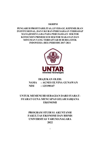 Gunawan, Agnes (2022) PENGARUH PROFITABILITAS, LEVERAGE, KEPEMILIKAN INSTITUSIONAL, DAN UKURAN PERUSAHAAN TERHADAP MANAJEMEN LABA PADA PERUSAHAAN SEKTOR KONSUMEN PRIMER SUB SEKTOR MAKANAN DAN MINUMAN YANG TERDAFTAR DI BURSA EFEK INDONESIA (BEI) PERIODE 2017-2021. Skripsi thesis, Universitas Tarumanagara.