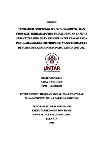 Anthony, Anthony (2023) PENGARUH PROFITABILITAS, PERTUMBUHAN PENJUALAN, DAN UKURAN PERUSAHAAN TERHADAP NILAI PERUSAHAAN DENGAN STRUKTUR MODAL SEBAGAI VARIABEL INTERVENING PADA PERUSAHAAN SEKTOR PROPERTI YANG TERDAFTAR DI BURSA EFEK INDONESIA PADA TAHUN 2019-2021. Skripsi thesis, Universitas Tarumanagara.