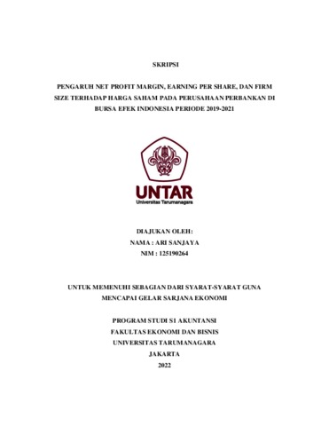 Sanjaya, Ari (2022) PENGARUH NET PROFIT MARGIN, EARNING PER SHARE DAN FIRM SIZE TERHADAP HARGA SAHAM PADA PERUSAHAAN PERBANKAN DI BURSA EFEK INDONESIA PERIODE 2019-2021. Skripsi thesis, Universitas Tarumanagara.