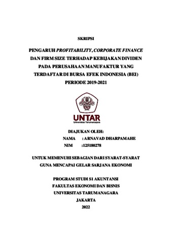 Dharpamahe, Arnavad (2022) PENGARUH PROFITABILITY, CORPORATE FINANCE DAN FIRM SIZE TERHADAP KEBIJAKAN DIVIDEN PADA PERUSAHAAN MANUFAKTUR YANG TERDAFTAR DI BURSA EFEK INDONESIA (BEI) PERIODE 2019- 2021. Skripsi thesis, Universitas Tarumanagara.
