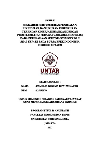 Kusuma, Camelia (2022) PENGARUH PERTUMBUHAN PENJUALAN, LIKUIDITAS, DAN UKURAN PERUSAHAAN TERHADAP KINERJA KEUANGAN DENGAN PROFITABILITAS SEBAGAI VARIABEL MODERASI PADA PERUSAHAAN SEKTOR PROPERTY DAN REAL ESTATE YANG TERDAFTAR PADA BURSA EFEK INDONESIA PERIODE 2019-2021. Skripsi thesis, Universitas Tarumanagara.