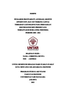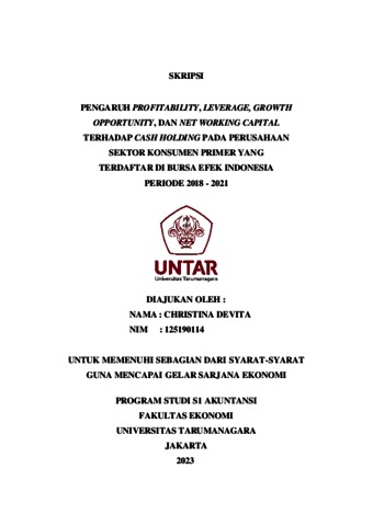 Devita, Christina (2023) PENGARUH PROFITABILITY, LEVERAGE, GROWTH OPPORTUNITY, DAN NET WORKING CAPITAL TERHADAP CASH HOLDING PADA PERUSAHAAN SEKTOR KONSUMEN PRIMER YANG TERDAFTAR DI BURSA EFEK INDONESIA PERIODE 2018 - 2021. Skripsi thesis, Universitas Tarumanagara.