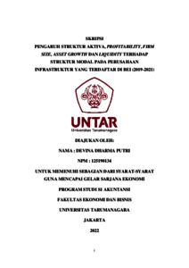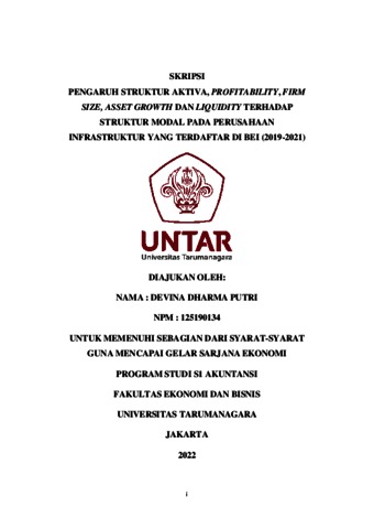 Dharma, Devina (2022) PENGARUH STRUKTUR AKTIVA, PROFITABILITY, FIRM SIZE, ASSET GROWTH DAN LIQUIDITY TERHADAP STRUKTUR MODAL PADA PERUSAHAAN INFRASTRUKTUR YANG TERDAFTAR DI BEI (2019-2021). Skripsi thesis, Universitas Tarumanagara.