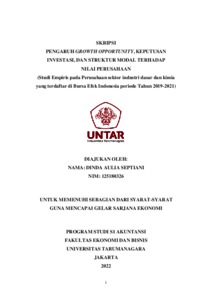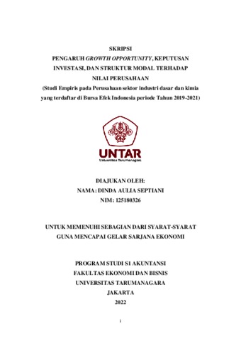 Aulia, Dinda (2022) PENGARUH GROWTH OPPORTUNITY, KEPUTUSAN INVESTASI, DAN STRUKTUR MODAL TERHADAP NILAI PERUSAHAAN (Studi Empiris pada Perusahaan sektor industri dasar dan kimia yang terdaftar di Bursa Efek Indonesia periode Tahun 2019-2021). Skripsi thesis, Universitas Tarumanagara.