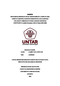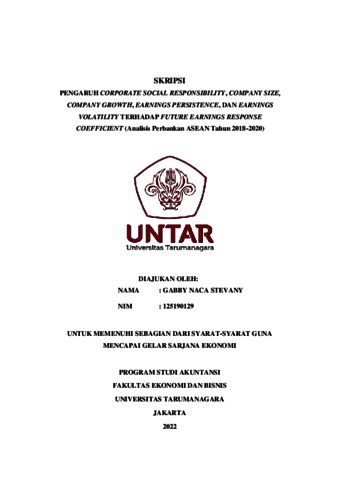 Naca, Gabby (2022) PENGARUH CORPORATE SOCIAL RESPONSIBILITY, COMPANY SIZE, COMPANY GROWTH, EARNINGS PERSISTENCE, DAN EARNINGS VOLATILITY TERHADAP FUTURE EARNINGS RESPONSE COEFFICIENT (Analisis Perbankan ASEAN Tahun 2018-2020). Skripsi thesis, Universitas Tarumanagara.