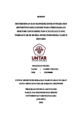 Velicia, Gabie (2022) DETERMINAN DAN KONSEKUENSI INTEGRATED REPORTING DISCLOSURE PADA PERUSAHAAN SEKTOR CONSUMERS NON-CYCLICALS YANG TERDAFTAR DI BURSA EFEK INDONESIA TAHUN 2019-2021. Skripsi thesis, Universitas Tarumanagara.