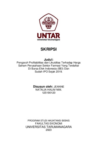 Natalia, Jeanne (2023) Pengaruh Profitabilitas dan Likuiditas Terhadap Harga Saham Perusahaan Sektor Farmasi Yang Terdaftar Di Bursa Efek Indonesia (BEI) Dan Sudah IPO Sejak 2019. Skripsi thesis, Universitas Tarumanagara.