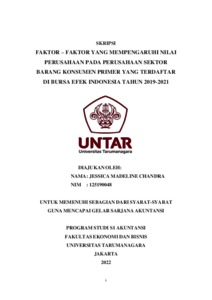Madeline, Jessica (2022) FAKTOR – FAKTOR YANG MEMPENGARUHI NILAI PERUSAHAAN PADA PERUSAHAAN SEKTOR BARANG KONSUMEN PRIMER YANG TERDAFTAR DI BURSA EFEK INDONESIA TAHUN 2019-2021. Skripsi thesis, Universitas Tarumanagara.