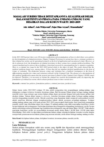 Adhari, Ade and Widyawati, Anis and Aryani, Fajar Dian and Musmuliadin, Musmuliadin (2021) Masalah Yuridis Tidak Ditetapkannya Kualifikasi Delik Dalam Ketentuan Pidana Pada Undang-Undang Yang Disahkan Dalam Kurun Waktu 2015-2019. Jurnal Muara Ilmu Sosial, Humaniora, dan Seni, 5 (1). ISSN 2579-6348