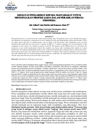 Adhari, Ade and Malvin, Jati Kuncara Alam W (2022) Kegiatan Pengabdian Kepada Masyarakat Untuk Mengenalkan Profesi Jaksa Dalam Peradilan Pidana Indonesia. Seri Seminar Nasional Universitas Tarumanagara (SERINA UNTAR 2022).
