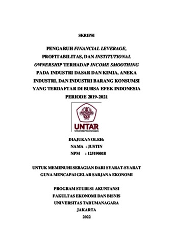 Justin, Justin (2022) PENGARUH FINANCIAL LEVERAGE, PROFITABILITAS, DAN INSTITUTIONAL OWNERSHIP TERHADAP INCOME SMOOTHING PADA INDUSTRI DASAR DAN KIMIA, ANEKA INDUSTRI, DAN INDUSTRI BARANG KONSUMSI YANG TERDAFTAR DI BURSA EFEK INDONESIA PERIODE 2019-2021. Skripsi thesis, Universitas Tarumanagara.