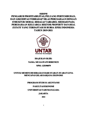 Berenice, Muliawati (2022) PENGARUH PROFITABILITAS, PELUANG PERTUMBUHAN, DAN LIKUIDITAS TERHADAP NILAI PERUSAHAAN DENGAN STRUKTUR MODAL SEBAGAI VARIABEL MEDIASI PADA PERUSAHAAN KELUARGA SEKTOR PROPERTY DAN REAL ESTATE YANG TERDAFTAR DI BURSA EFEK INDONESIA TAHUN 2019-2021. Skripsi thesis, Universitas Tarumanagara.