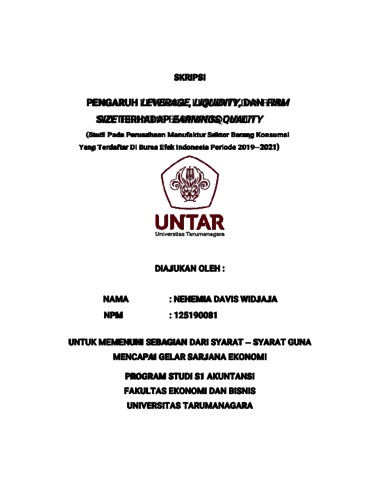Davis, Nehemia (2022) PENGARUH LEVERAGE, LIQUIDITY, DAN FIRMSIZETERHADAP EARNINGSQUALITY (STUDI PADA PERUSAHAAN MANUFAKTUR SEKTOR BARANG KONSUMSI YANG TERDAFTAR DI BURSA EFEK INDONESIA PERIODE 2019-2021). Skripsi thesis, Universitas Tarumanagara.