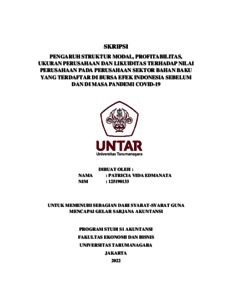 Vida, Patricia (2022) PENGARUH STRUKTUR MODAL, PROFITABILITAS, UKURAN PERUSAHAAN DAN LIKUIDITAS TERHADAP NILAI PERUSAHAAN PADA PERUSAHAAN SEKTOR BAHAN BAKU YANG TERDAFTAR DI BURSA EFEK INDONESIA SEBELUM DAN DI MASA PANDEMI COVID-19. Skripsi thesis, Universitas Tarumanagara.