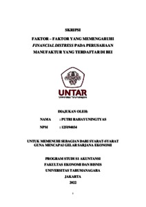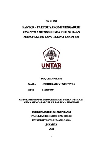 Rahayuningtyas, Putri (2022) FAKTOR – FAKTOR YANG MEMENGARUHI FINANCIAL DISTRESS PADA PERUSAHAAN MANUFAKTUR YANG TERDAFTAR DI BEI. Skripsi thesis, Universitas Tarumanagara.