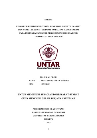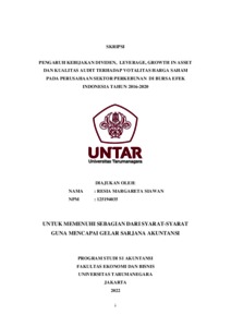 Margareta, Resia (2022) PENGARUH KEBIJAKAN DIVIDEN, LEVERAGE, GROWTH IN ASSET DAN KUALITAS AUDITOR TERHADAP VOTALITAS HARGA SAHAM PADA PERUSAHAAN SEKTOR PERKEBUNAN DI BURSA EFEK INDONESIA TAHUN 2016-2020. Skripsi thesis, Universitas Tarumanagara.