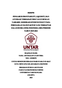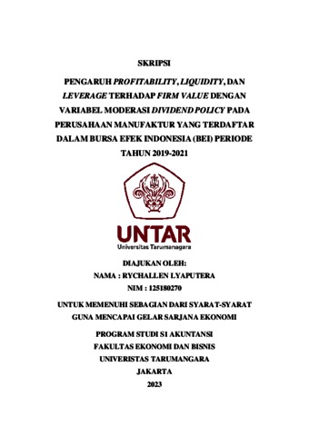 Lyaputera, Rychallen (2022) PENGARUH PROFITABILITY, LIQUIDITY, DAN LEVERAGE TERHADAP FIRM VALUE DENGAN VARIABEL MODERASI DIVIDEND POLICY PADA PERUSAHAAN MANUFAKTUR YANG TERDAFTAR DALAM BURSA EFEK INDONESIA (BEI) PERIODE TAHUN 2019-2021. Skripsi thesis, Universitas Tarumanagara.