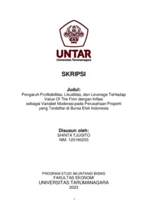 Tjugito, Shinta (2023) Pengaruh Profitabilitas, Likuiditas, dan Leverage Terhadap Value Of The Firm dengan Inflasi sebagai Variabel Moderasi pada Perusahaan Properti yang Terdaftar di Bursa Efek Indonesia. Skripsi thesis, Universitas Tarumanagara.