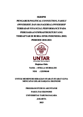 Mursalim, Stella (2023) PENGARUH POLITICAL CONNECTION, FAMILY OWNERSHIP, DAN MANAGERIAL OWNERSHIP TERHADAP FINANCIAL PERFORMANCE PADA PERUSAHAAN INFRASTRUKTUR YANG TERDAFTAR DI BURSA EFEK INDONESIA (BEI) PERIODE 2018-2021. Skripsi thesis, Universitas Tarumanagara.