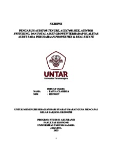 Clarissa, Tasya (2023) PENGARUH AUDITOR TENURE, AUDITOR SIZE, AUDITOR SWITCHING, DAN TOTAL ASSET GROWTH TERHADAP KUALITAS AUDIT PADA PERUSAHAAN PROPERTIES & REAL ESTATE. Skripsi thesis, Universitas Tarumanagara.