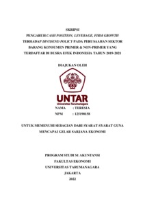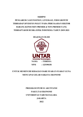 Teresia, Teresia (2022) PENGARUH CASH POSITION, LEVERAGE, FIRM GROWTH TERHADAP DIVIDEND POLICY PADA PERUSAAHAN SEKTOR BARANG KONSUMEN PRIMER & NON-PRIMER YANG TERDAFTAR DI BUSRA EFEK INDONESIA TAHUN 2019-2021. Skripsi thesis, Universitas Tarumanagara.