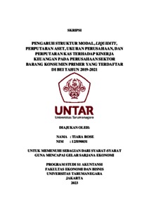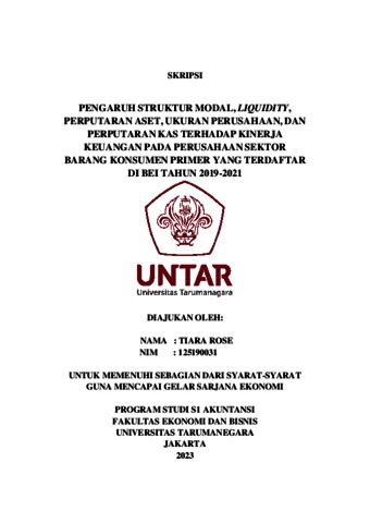 Rose, Tiara (2023) PENGARUH STRUKTUR MODAL, LIQUIDITY, PERPUTARAN ASET, UKURAN PERUSAHAAN, DAN PERPUTARAN KAS TERHADAP KINERJA KEUANGAN PADA PERUSAHAAN SEKTOR BARANG KONSUMEN PRIMER YANG TERDAFTAR DI BEI TAHUN 2019-2021. Skripsi thesis, Universitas Tarumanagara.