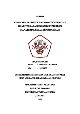 Sandra, Veronica (2022) PENGARUH PRUDENCE DAN GROWTH TERHADAP KUALITAS LABA DENGAN KEPEMILIKAN MANAJERIAL SEBAGAI PEMODERASI. Skripsi thesis, Universitas Tarumanagara.