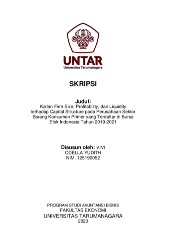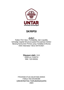 Odella, Vivi (2023) Kaitan Firm Size, Profitability, dan Liquidity terhadap Capital Structure pada Perusahaan Sektor Barang Konsumen Primer yang Terdaftar di Bursa Efek Indonesia Tahun 2019-2021. Skripsi thesis, Universitas Tarumanagara.