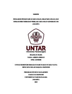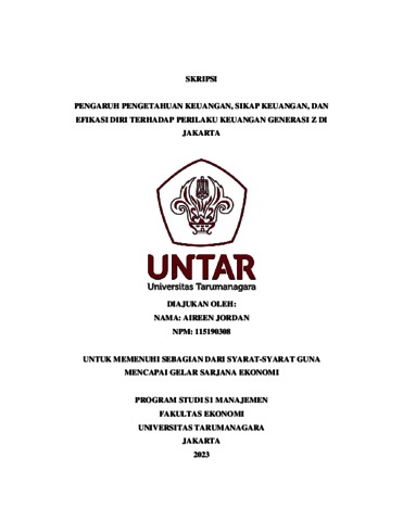 Jordan, Aireen (2023) PENGARUH PENGETAHUAN KEUANGAN, SIKAP KEUANGAN, DAN EFIKASI DIRI TERHADAP PERILAKU KEUANGAN GENERASI Z DI JAKARTA. Skripsi thesis, Universitas Tarumanagara.