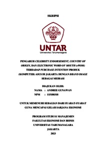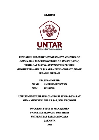 Gunawan, Andree (2023) PENGARUH CELEBRITY ENDORSEMENT, COUNTRY OF ORIGIN, DAN ELECTRONIC WORD OF MOUTH (eWOM) TERHADAP PURCHASE INTENTION PRODUK (KOMPUTER) ASUS DI JAKARTA DENGAN BRAND IMAGE SEBAGAI MEDIASI. Skripsi thesis, Universitas Tarumanagara.