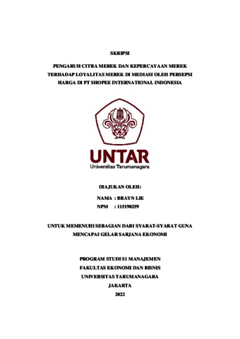 Lie, Bryan (2022) PENGARUH CITRA MEREK DAN KEPERCAYAAN MEREK TERHADAP LOYALITAS MEREK DI MEDIASI OLEH PERSEPSI HARGA DI PT SHOPEE INTERNATIONAL INDONESIA. Skripsi thesis, Universitas Tarumanagara.