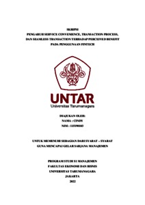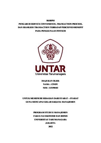 Cindy, Cindy (2022) PENGARUH SERVICE CONVENIENCE, TRANSACTION PROCESS, DAN SEAMLESS TRANSACTION TERHADAP PERCEIVED BENEFIT PADA PENGGUNAAN FINTECH. Skripsi thesis, Universitas Tarumanagara.