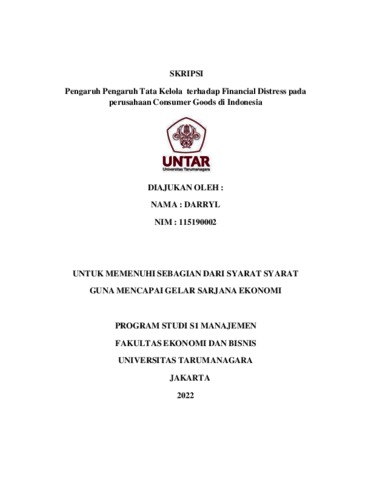 Darryl, Darryl (2022) Pengaruh Pengaruh Tata Kelola terhadap Financial Distress pada perusahaan Consumer Goods di Indonesia. Skripsi thesis, Universitas Tarumanagara.