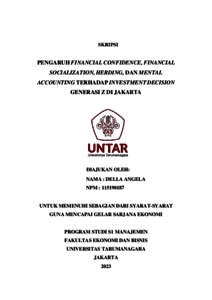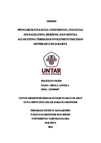 Angela, Della (2023) PENGARUH FINANCIAL CONFIDENCE, FINANCIAL SOCIALIZATION, HERDING, DAN MENTAL ACCOUNTING TERHADAP INVESTMENT DECISION GENERASI Z DI JAKARTA. Skripsi thesis, Universitas Tarumanagara.
