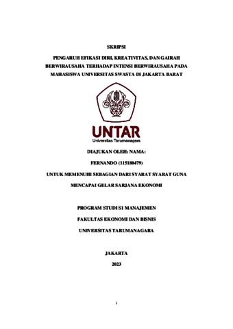 Fernando, Fernando (2023) PENGARUH EFIKASI DIRI, KREATIVITAS, DAN GAIRAH BERWIRAUSAHA TERHADAP INTENSI BERWIRAUSAHA PADA MAHASISWA UNIVERSITAS SWASTA DI JAKARTA BARAT. Skripsi thesis, Universitas Tarumanagara.